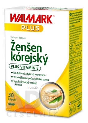Výživový doplnok rastlinný - obsahuje štandardizovaný výťažok z koreňa ženšenu a je kombinovaný s vitamínom E.