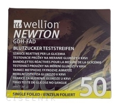 Zdravotnícka pomôcka. Testovacie prúžky na meranie hladiny glukózy v krvi Wellion NEWTO sú tenké prúžky s chemickým reagentným systémom. Slúžia na meranie koncentrácie glukózy s glukomermi Wellion NEWTON GAD-FAD. Krv sa nanáša na konček testovacieho prúžku. Krv sa potom automaticky nasaje do reakčnej zóny. Reakcia prebehne v reakčnej zóne prúžku. Počas reakcie dochádza k vytvoreniu prechodového prúdu, ktorý merač zachytí. Koncentrácia glukózy v krvi sa potom vypočíta na základe tohto prúdu. Výsledok sa následne zobrazí na displeji merača. Merače sú kalibrované tak, aby zobrazovali výsledky v ekvivalente plazmy. Na použitie pri diagnostike in vitro. Testovacie prúžky sú určené iba na použitie mimo tela a za účelom merania. Na samotestovanie a použitie profesionálmi.