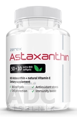 Výživový doplnok. Astaxanthin je prírodný karotenoid pochádzajúci z rias Haematococcus pluvialis. Vďaka prítomnosti vitamínu E pomáha chrániť bunky pred oxidačným stresom spôsobeným voľnými radikálmi. Riasa, z ktorej je tento produkt vyrobený, bola dopestovaná a spracovaná v Českej republike.